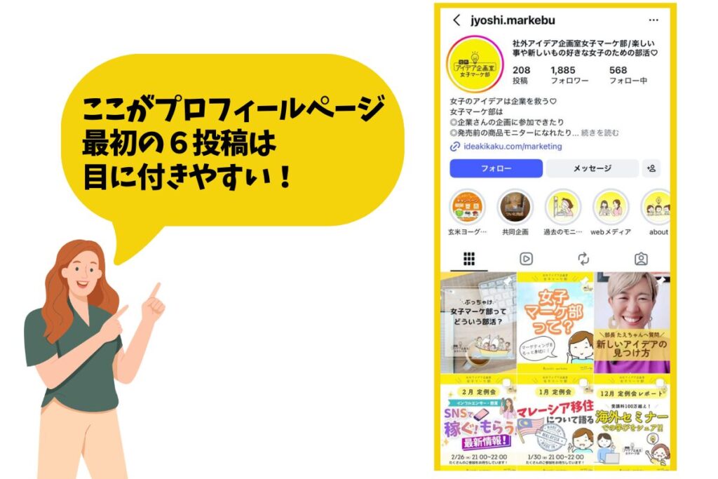 そうすると、見た人にジャンルが伝わりやすいから、最初の6投稿くらいは頑張って作るといいと思う。