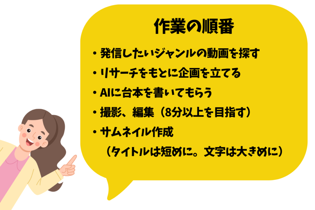 動画のタイトルは企画を立てる段階である程度考えておくんだけど、できるだけ短いタイトルの方がいいから、長かったらちょっと推敲して、そのタイトルでサムネイルを作る。作業の順番はこんな感じ。